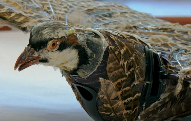 Dead birds preserved with taxidermy and powered with micro-size UAV electronics and servos are being converted into flying ornithopters at the New Mexico Institute of Mining and Technology in Socorro. A hybrot (short for ‘hybrid robot’) is a cybernetic robot that contains both computerized and biological elements. The hybrots will be used in the study of bird wildlife and for researching flock aerodynamics. In the photo showing an RC transmitter, Mechanical engineering professor Mostafa Hassanalian and Ph.D student Brenden Herkenhoff are working with a taxidermy bird drone at New Mexico Institute of Mining and Technology in Socorro, New Mexico. The light blue servos shown control the hybrot’s tail feathers in pitch and roll. An earlier iteration of what appears to be a test model shows a brushless motor and propeller. Story and photos via Zerohedge.com, and courtesy of REUTERS/Liliana SalgadoRead.